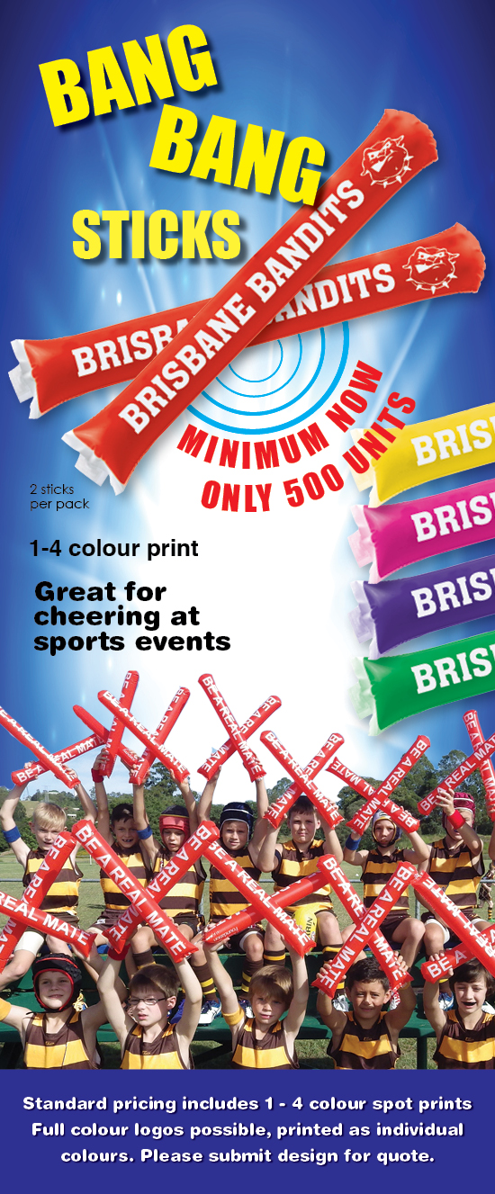 Create a thunderous applause and energize any event with our Inflatable Bang Bang Sticks! Made from durable white polyethylene, these sealed tubes produce a loud clapping sound when hit together, making them perfect for sports events, concerts, and rallies. Each set includes two matching sticks packed in a polybag, along with an inflating straw and instructions for easy setup. Customize them with your design, available with round or square corners and up to a four-colour print on each side.